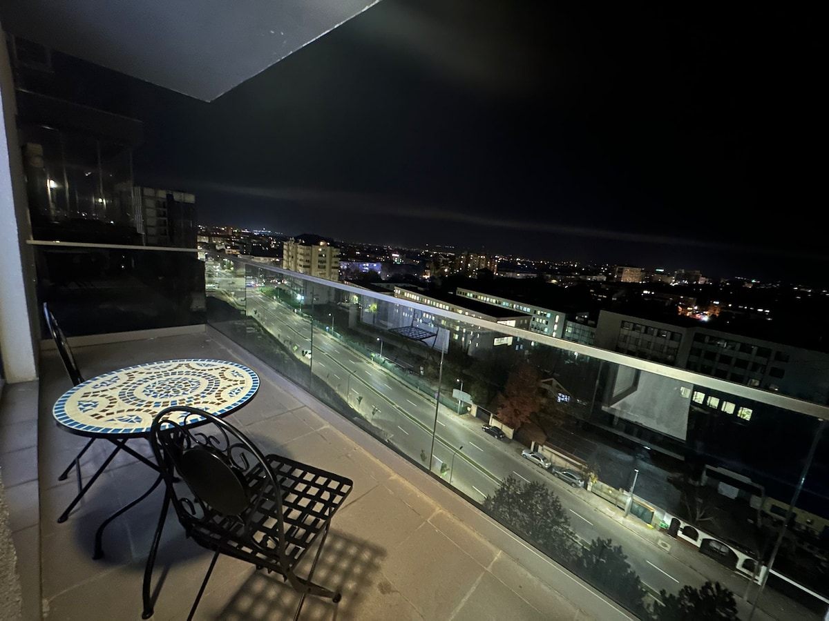 Enjoy a comfortable stay in this modern apartment located on the 9th floor, offering a spectacular view over the hills at the edge of Craiova. Ideal for business travelers or holidays, our apartment is perfectly located, being close to the airport, train station and local Mall. The apartment has a comfortable bed, an extensible sofa for a restful sleep and two bathrooms, ensuring space and comfort for all guests.