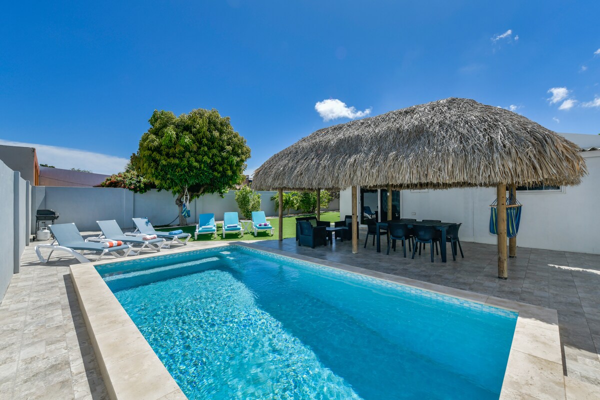 Experience Aruba at this cozy home featuring an extra-large private pool in a tropical garden.The spacious pool area boasts a deck with comfortable lounge chairs, an outdoor patio, with a grill. Enjoy your day by the pool or take a short 15-minute stroll to the nearest beach. Inside, a modern kitchen equipped with all essentials awaits. The entire house is air-conditioned, and the bedrooms are both modern and roomy. Make lasting memories with friends and family at this perfect vacation home.