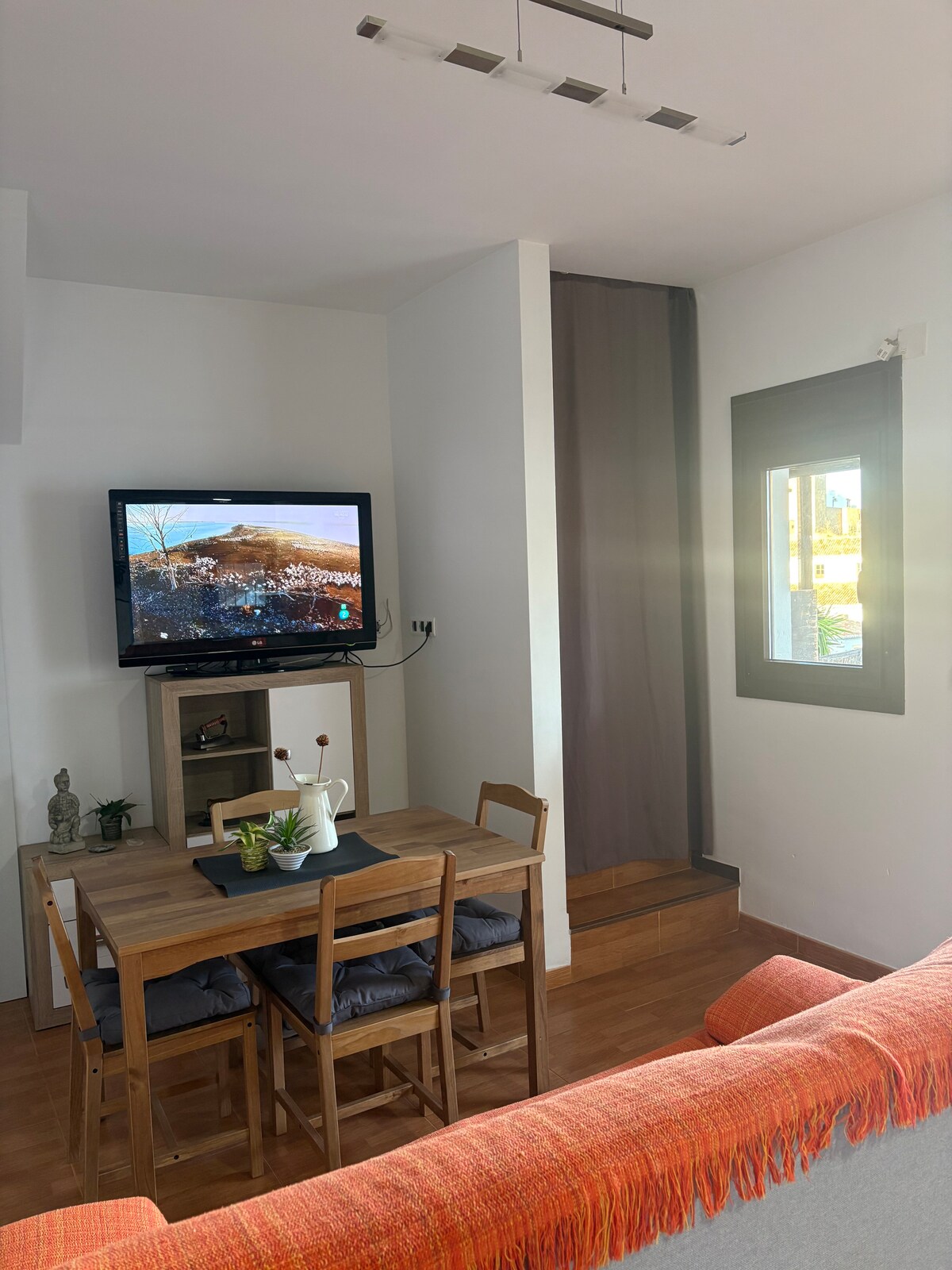 The El Mirador de la Torre house is a modern country house inaugurated in June 2021 in the heart of the Morería neighborhood in Constantina, Seville. House with space for 4 people, where rest and relaxation will be its hallmark. The house is divided into 2 floors. On the first floor, there is a very modern kitchen, a living room with a smart TV, and a full bathroom with a rain shower. Upstairs, we see the sloping ceilings, a 160x200 bed, and 90x200 beds.