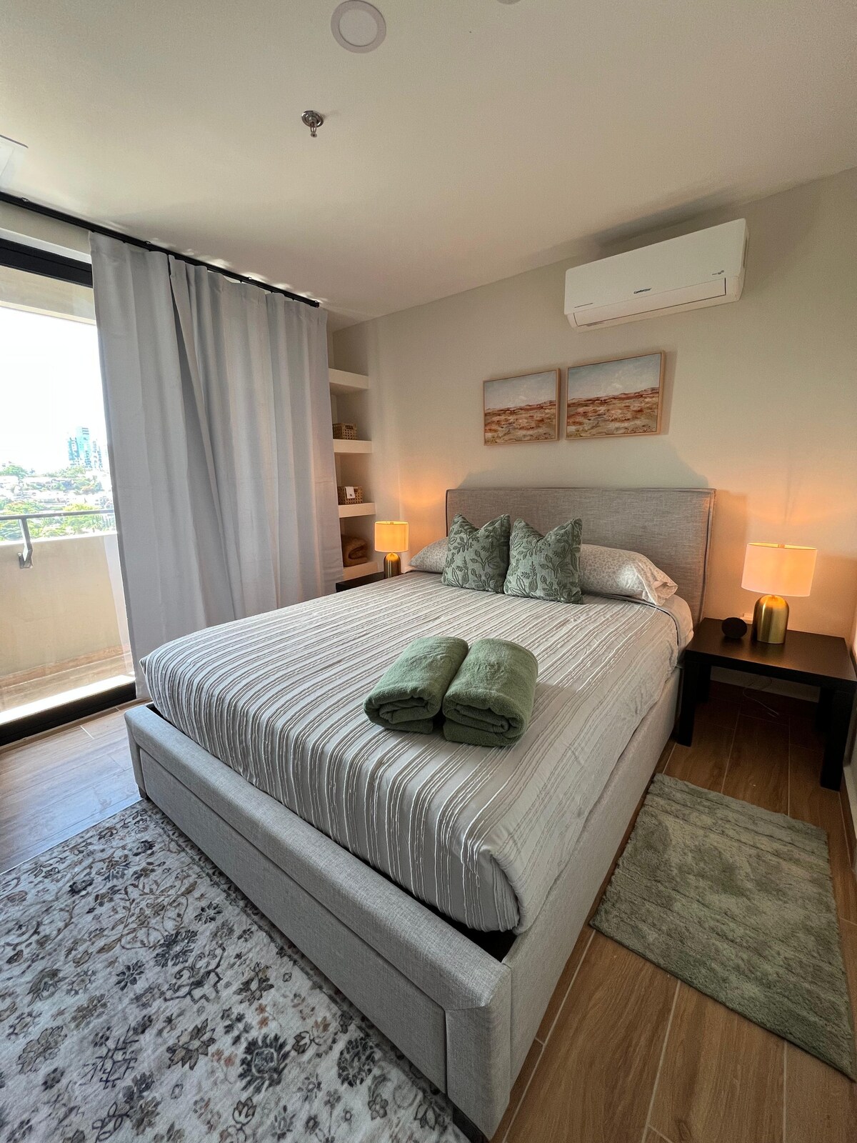 Enjoy a stylish experience at this centrally-located and fully-equipped place for a relaxing and working stay with a panoramic view of Tegucigalpa, and a full private bathroom. It has kitchen utensils, stove, A/C, refrigerator, iron, TV with Streaming MAX programming, high-speed Internet, and a washing machine inside the apartment so you can save more. It has common areas: a gym and kiosks for social gatherings, the use of which is reserved by prior arrangement.