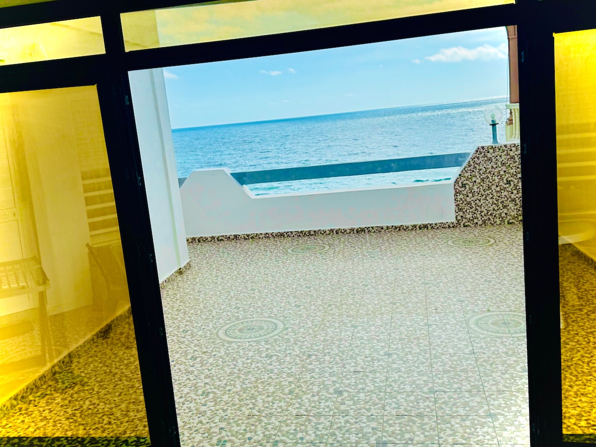 A beautiful waterfront villa 2S+3 well furnished in a very quiet area located in Kelibia it consists of: •a large living room with access to a garden overlooking the sea • another intimate living room •03 bedrooms. •A very well-equipped kitchen (gas, fridge ...) •Bathroom, shower •Two grassed gardens the first is located by the beach, the other allowing access to cars .