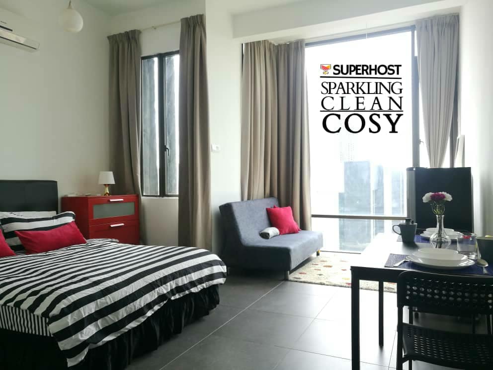 This is a Simple Yet Comfy studio where we put a lot of effort in it! We provide free movies, free WiFi. Besides from the bed, the space does come with a pantry area, a small living area, and a full size bathroom. Our unit gives you Damansara skyline view and you can also see the PNB 118 and KLCC tower at the far end of the hill. This unit also allows food deliveries up to your door step which allows you to get your food even you are in your pyjamas!