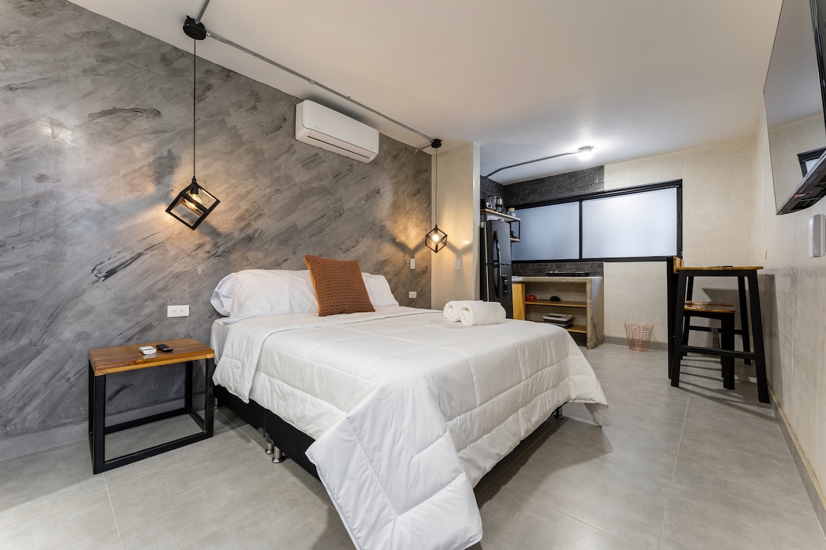 • Wide open spaces, loads of green around • Pool + Hot tub in common areas • Modern, independent, fully furnished Loft • Air Conditioning • Amazing location. Golden Mile: "Oasis in the middle of the best part of Poblado, just far away enough from the noise, but walking distance to the heart" • High speed 100 Mb WiFi • Extremely safe neighborhood • Fully equipped kitchen • 43" Smart TV with Netflix + Cable TV • On site, 24/7 staff • Strictly cleaned and santized • 24/7 staff always ready to help