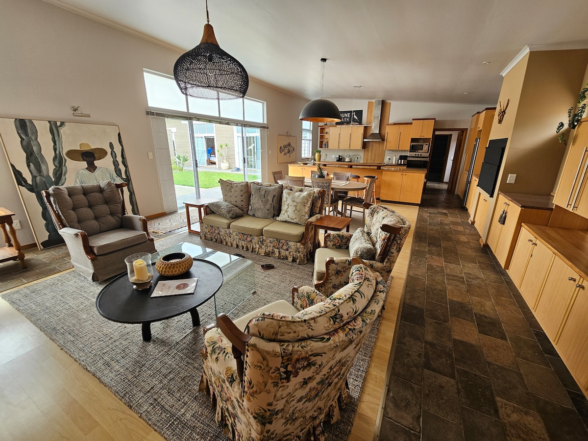 Beautiful, artistically decorated and very well equipped 3 bedroom, 3 bathroom house, ideal for families. 2 Bedrooms are in the main part, and the 3rd is directly adjacent, with its own bathroom and kitchen. This house is uniquely designed and built around a lovely courtyard with barbeque and firepit facilities to ensure protection from the coastal elements. Conveniently located 300m from the Ocean View shopping complex, 1.4km from Platz am Meer Mall and 6km from central Swakopmund.