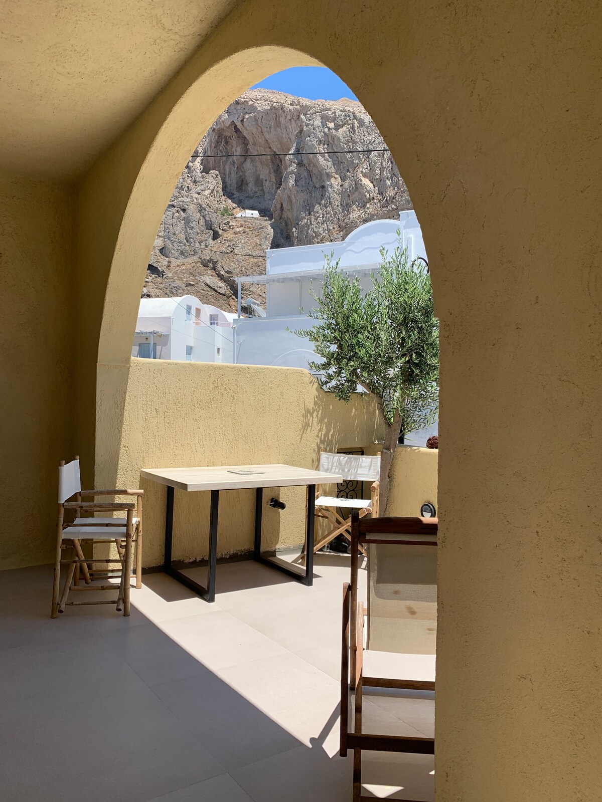 The studio consist of a small fridge convection cooker, air condition, wifi, own tilled bathroom build in wardrobe and a kitchen with a sink and marble top to prepare your summer meals and enjoy them garden around pomegranate trees pistachio trees and olive trees. We are 2 minutes walk away from the famous black sanded beach of Perissa