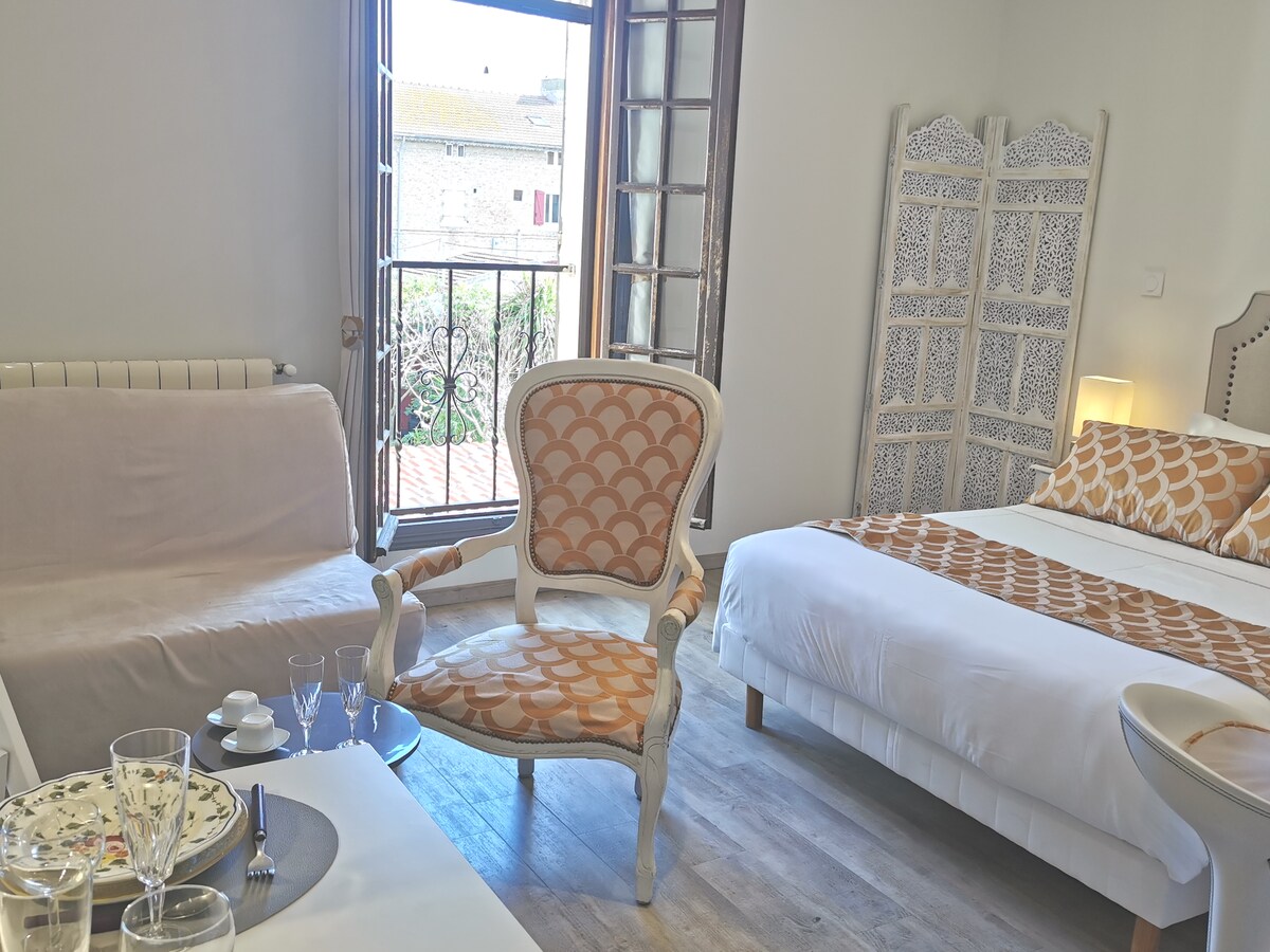 T2 de charme 30 m2 au calme, chambre indépendante. Salon, cuisine équipée ouverte, vaisselle, plaques induction, hotte, four micro ondes et grill, cafetière SENSEO, Bouilloire, Grille-pain, Cuit-vapeur, Frigo Top, Congélateur Top. Salle de bains avec douche italienne et lavabo 1 vasque. WC séparés. Chambre Literie qualité Hôtelière, 2 lits 90x190 pouvant être réunis en 1 lit 180, 1 Placard, 1 commode, 1 bureau télétravail. Salon canapé méridienne convertible 140x190, TV SAMSUNG HD, WiFi fibre