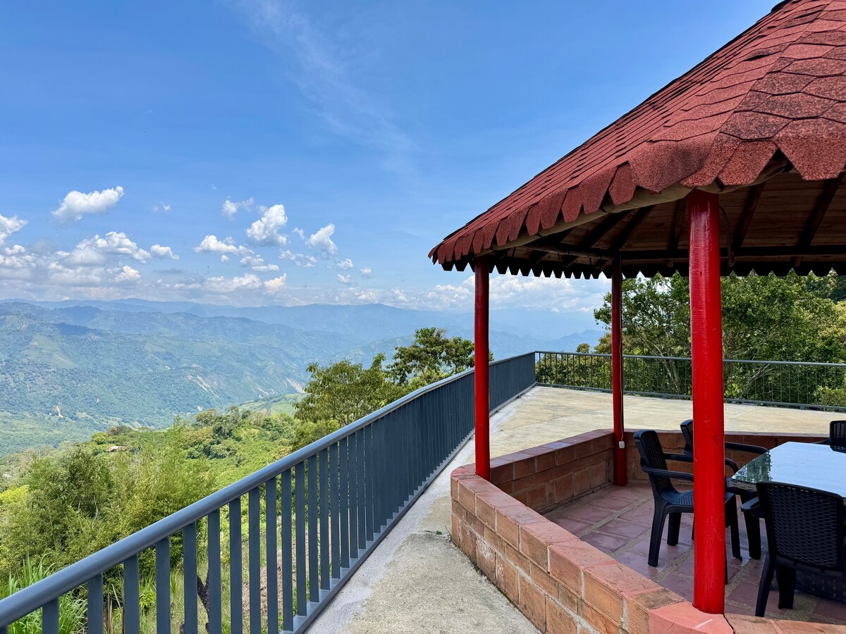 Amazing luxury house in the middle of nature, perfect for couples and small families looking for a private place, ideal for relaxing, enjoying the charm of southwestern Antioquia and a luxury experience. Enjoy the best sunsets and the best view of the cliffs of La Pintada and the Cauca River. It has internet for those who need to telecommute, a soccer field for athletes, and a swimming pool with an incredible view