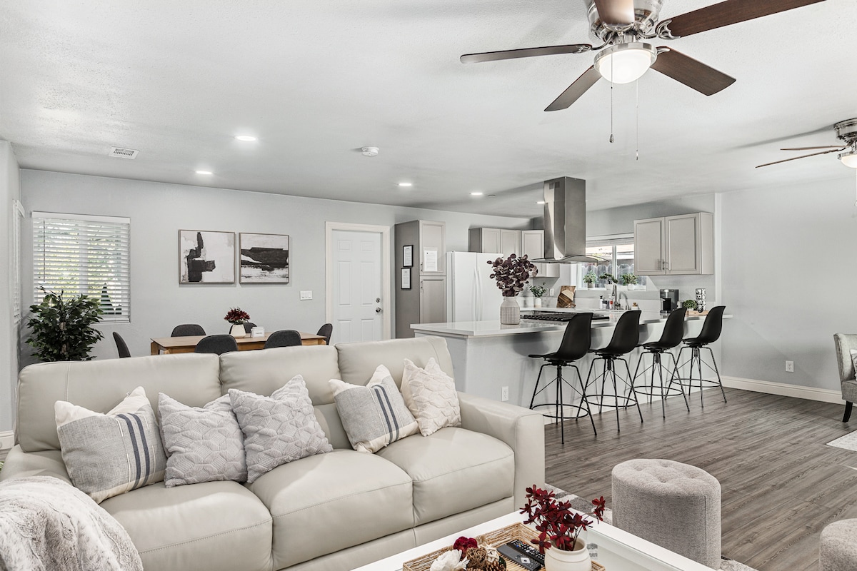 Welcome to our stunning Airbnb in prime North East Fresno! This contemporary hidden gem offers style and comfort. Rest easy on the King memory foam hybrid mattress or the Queen memory foam mattress. Enjoy the fully-equipped designer kitchen, Smart TVs, and free Wi-Fi. Need to work from home? No problem! Find office space here. Restaurants/ Markets within a mile. Woodward Park, just 5 minutes away. Yosemite National Park, 1.15 hours away