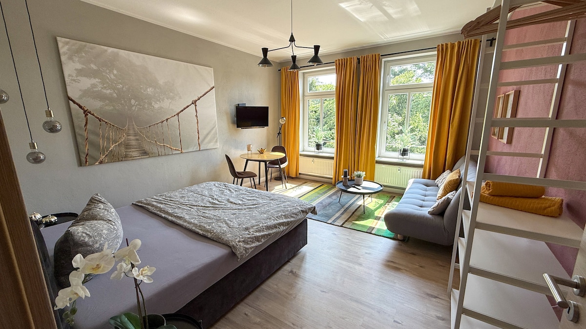 Welcome to Villa Kunterbunt. Our property is located in the historic city center of Gera. Despite the central location, you will stay extremely quietly and overlooking the treetops. Shopping is within walking distance in 5 - 10 minutes and public transport connections run almost at the doorstep. We offer you a furnished apartment with fully equipped kitchen and free Wi-Fi. If you have any questions or problems, we are nearby and can be reached by phone. See you soon Tom & Julia