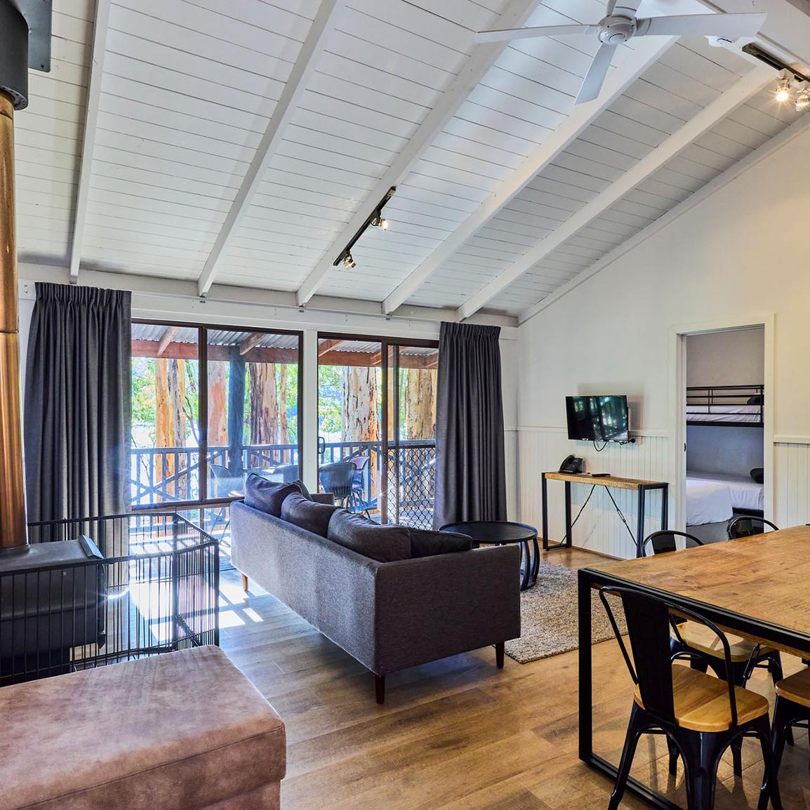 This Two Bedroom Chalet offers stunning forest views and a peaceful setting beneath the trees. This chalet contains a queen bed and two single beds, making it ideal for two couples or a family. Accommodation facilities include free Wi-Fi, a log fire with pre-chopped wood (winter only), air conditioning, kitchen with fridge, stovetop, and microwave, a bathroom and a lounge and dining area with a TV. Enjoy the views from your private balcony, complete with dining setting for alfresco meals.