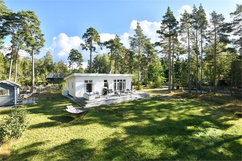 Peaceful home completed in 2023. Fully-equipped with everything a family with children or a group of friends need. Entire 117 sqm and associated land of over 2000 sqm. Three bedrooms, a living room, a large kitchen with a dining area, a bathroom, a toilet and a laundry room. EV charging is installed and can be provided for a fee. Patio with barbecue is available. Total sleeps 8 in the villa. Beach only a stone's throw away (about 70 meters) and also the well-known lake tavern in Valleviken.