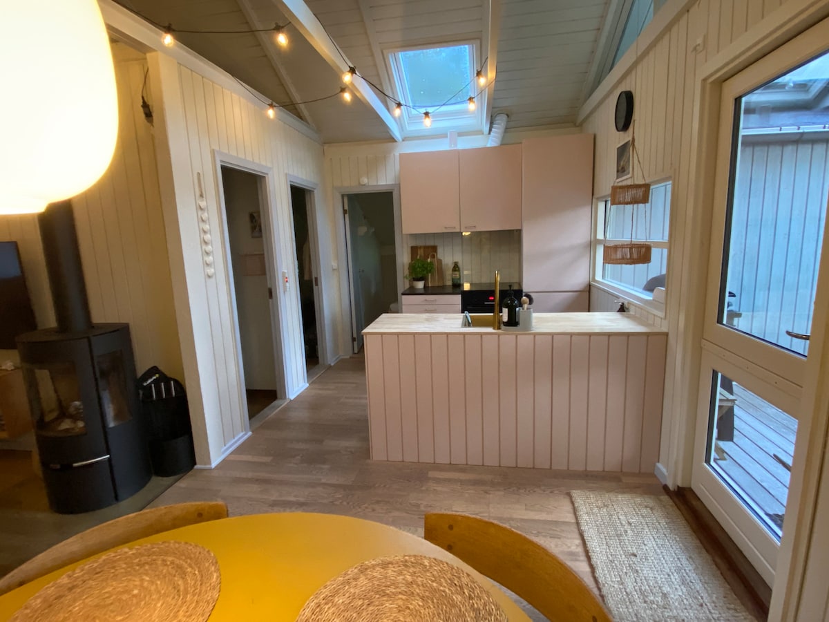"The cabin" is a fully insulated wooden cabin with underfloor heating in all rooms. Large living room with kitchen (sofa bed), one room (sofa bed), toilet with bath and a large loft. The “cabin” is 66 m2 and was newly built in 2017. It is located at the bottom of our garden in a private villa area overlooking open fields and trail systems close to forest and beach. There is a path to the water (10 min. walk) and Glyngøre town, where you will find shopping and restaurants. The kitchen includes fridge/freezer, oven, hobs, kettle, coffee maker, service.
