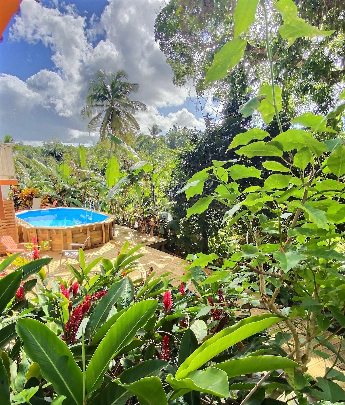 Notre Logement de 60 m2, situé dans les hauteurs de Ste Rose, dans un quartier calme et ventilé est composé d une cuisine équipée ouverte sur le salon, de 2 chambres climatisées, une salle d eau double vasques, douche à l italienne et toilettes séparées. Il dispose également d un carbet et son bassin privatifs. Vue mer des Caraïbes, à 2 km des bains soufrés de Sofaïa, des sentiers de randonnée et à 5 km des premières plages sans sargasses….