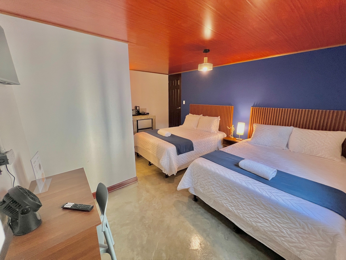 Perfect location around restaurants, shops, a place where you can rest easy. The room is located on the third level. There are no hoists. There are no elevators. It has two queen beds, private bathroom with hot water, soap towels and shampoo. You can use the social areas of the hotel (rooms, terrace, dining room) You have the right of right of parking.