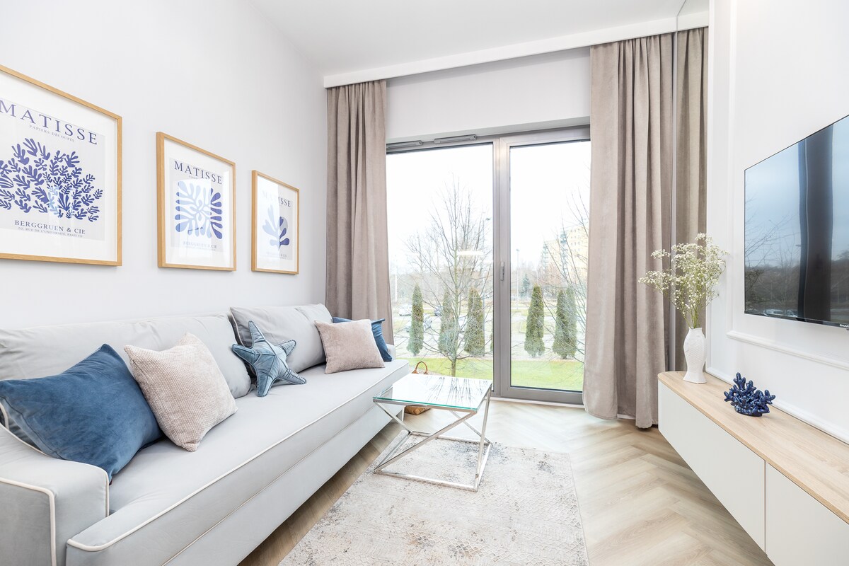Welcome to Chicago! The apartment is finished in an elegant but very cozy style. At your disposal there will be a living room with a relaxation area and a fully equipped kitchenette, there is also a sleeping space with a large double bed and a bathroom with a bathtub where you can relax with an aromatic bath. The apartment can easily accommodate up to 4 people thanks to the fold-out sofa. From the large windows you can admire the beautifully landscaped courtyard.