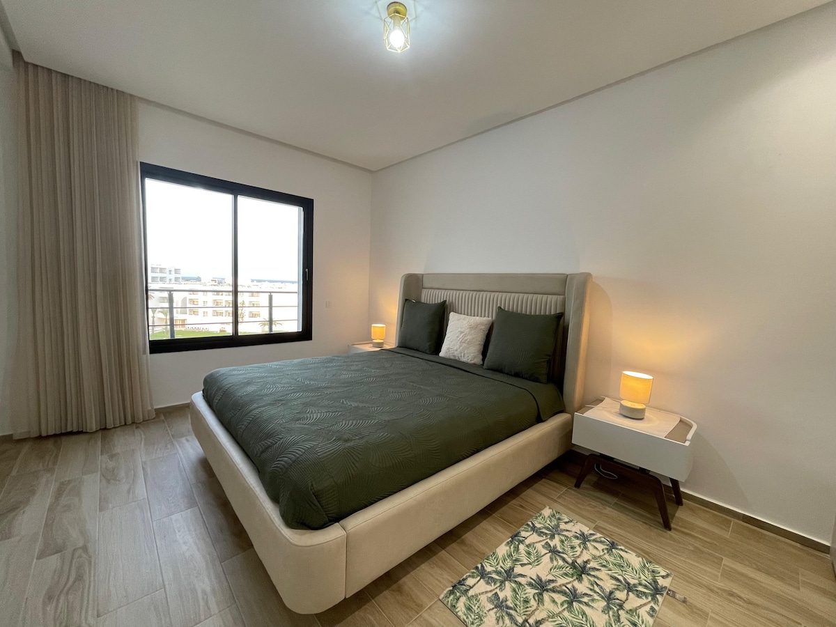 Get closer to your loved ones in this family home. It is a luxurious, well equipped 120m2 apartment that has two spacious bedrooms with dressing room. The living room opens onto a large balcony. The residence offers the inhabitants a gigantic swimming pool with space dedicated to children. Conveniently located, this space combines modern comfort and authentic atmosphere, with decorative touches inspired by the mythical cities of Tunisia such as Sidi Bou Said and Hammamet.