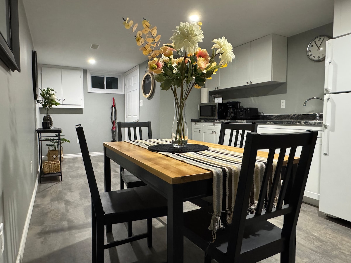 Forget your worries in this quiet and comfortable 1 bedroom basement apartment. Bedroom has a comfortable queen bed - perfect for the solo traveller or couple. Fully equipped kitchen with all your cooking essentials and a spacious washroom with walk-in shower. Come kick back and relax in your own space.
