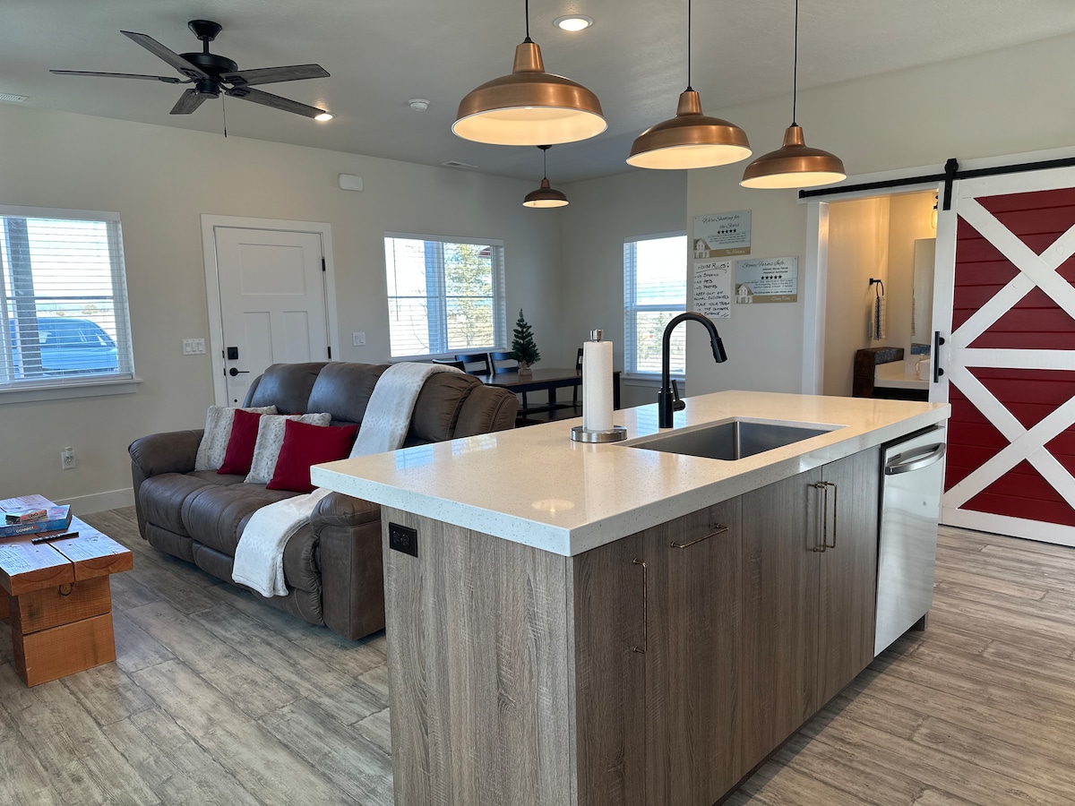 NO CHECK-OUT CHORES REQUIRED! Just like a vacation should be! Enjoy Mini Golf here on the farm⛳️ Come see baby calves, bunnies and 50+ animals. Enjoy our Luxury Barn on our picturesque farm. Just minutes away from Bryce Canyon National Park, Fishing, Hiking, ATV trails & all the great outdoors has to offer. Fall in love with the New Stoney Farms, complete with farm animals, walking trails & sitting areas you can relax and enjoy the beauty. Bedroom 2 is an open nook. “Wedding Barn” coming soon!