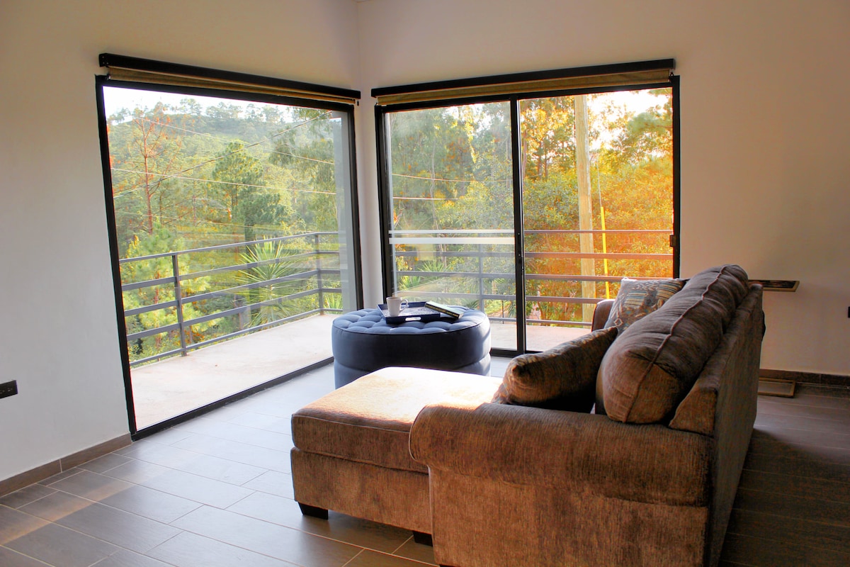 🙏FAMILY ONLY: Casa Jardín is a cozy place located on the outskirts of Valle de Ángeles, to enjoy moments of maximum tranquility and privacy with the family, away from the hustle and bustle of the city. The cabin consists of an extensive living room, a large and functional kitchen, a master bedroom with a queen bed and private bathroom, 3 sofa beds. Outside you can enjoy sitting areas, a barbecue area, a fire pit, bathrooms, beautiful gardens, a soccer field, and fruit trees.