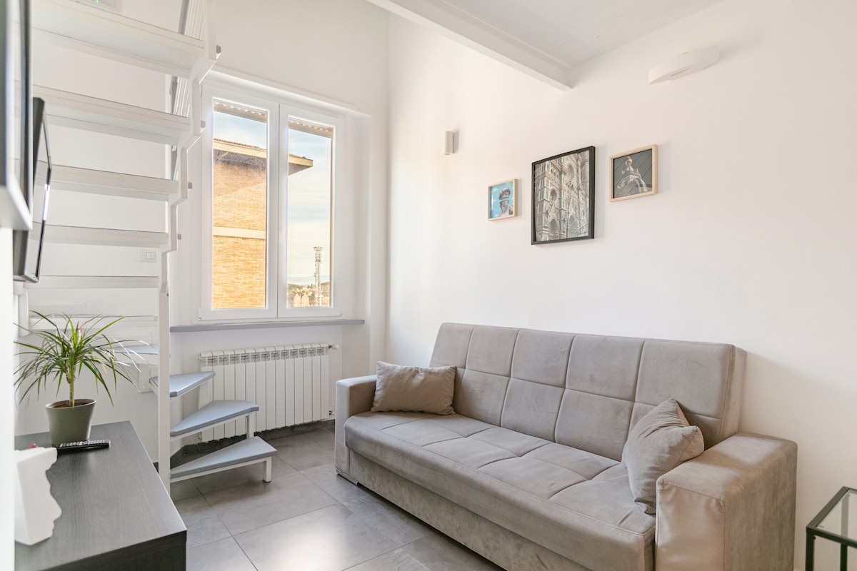 This intimate and discreet studio is located on the top floor of a building in the historic city center, just steps from the main tourist attractions. It features a living area and a sleeping area separated by a mezzanine. The studio has a private bathroom but no kitchen. The bright space offers a privileged view of the Duomo and Palazzo Vecchio, while its romantic and cozy atmosphere makes it perfect for a romantic getaway.
