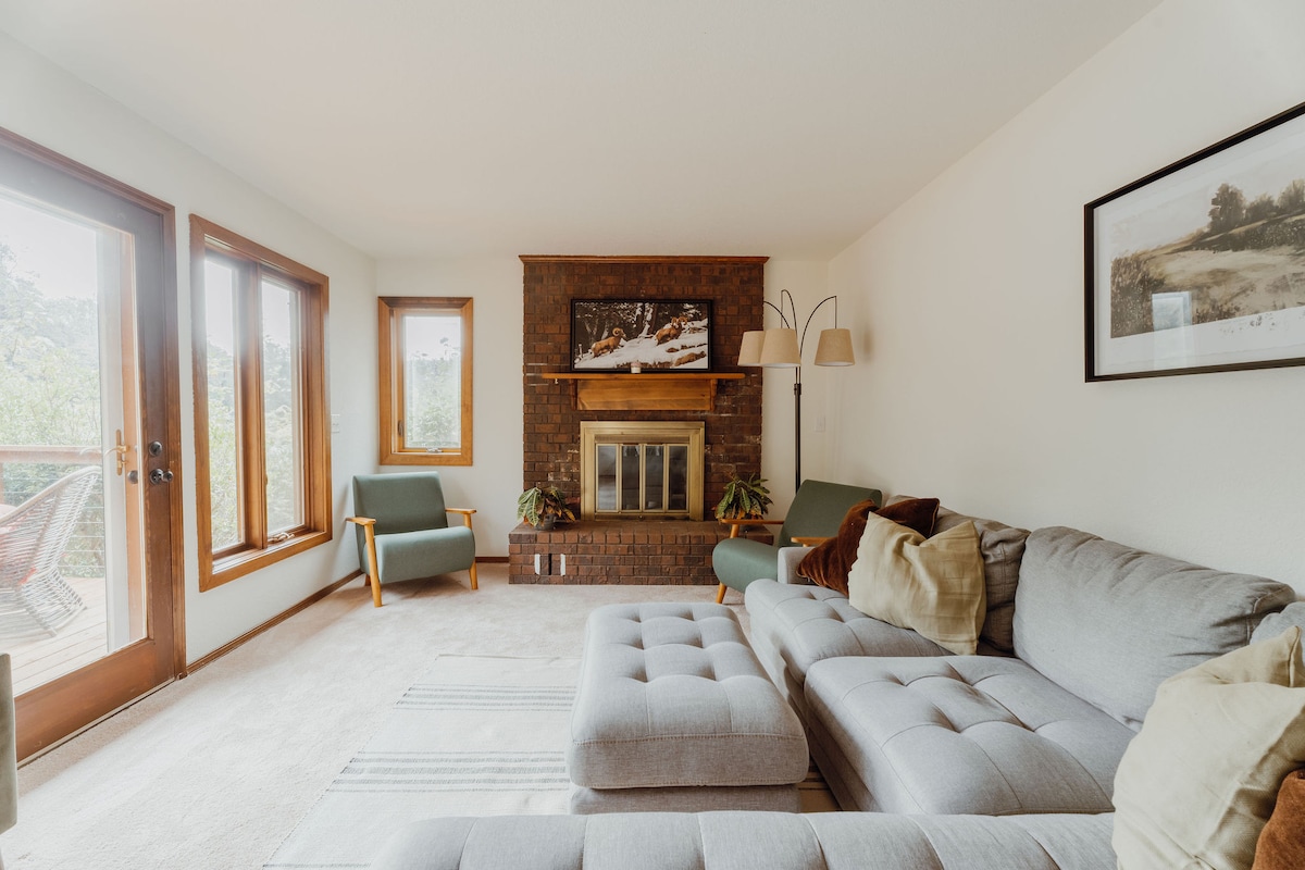 Escape to luxury at Ramblin’ Rose, a modern riverfront cabin. The meticulously designed space with a vaulted ceiling, skylights, and panoramic windows offers a full kitchen, spa-like bath, and cozy gas fireplace. Opt for the loft's king bed or the main floor's ultra-comfy king sofa bed. Relax in the hot tub on the expansive deck with breathtaking scenery. Ramblin’ Rose seamlessly blends sophistication, comfort, and serenity for an unforgettable escape. Rent with Wild Lily for larger groups.