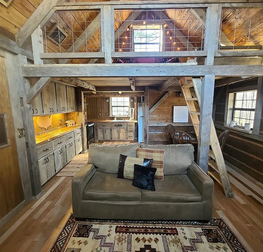 2-story living space sleeps up to 6. Downstairs has a kitchenette (no stove or kitchen sink) with a microwave, coffee pot, mini frig and utensils. Dish tub provided, and you can wash dishes outside. Outdoor charcoal grill. 2 can sleep on the Futon sofa bed. Lg walk in shower in bathroom. Upstairs has 1 queen, 2 twin beds with 1/2 bath. Outdoor charcoal grill, electric skillet & air fryer. Located on 300-acre farm on Ouachita River with easy access for floats, fishing & private hikes.