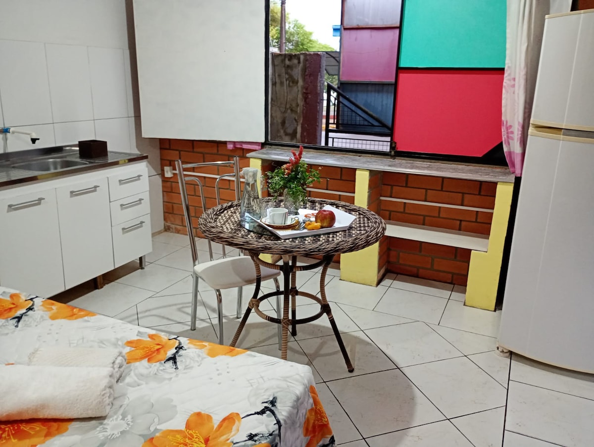 Entire space in front of UNOESC for 2 people. Excellent location in the university district of Xanxerê. Private bathroom with hot shower. And bedroom, living room, kitchen with double bed, bedside table, armchair, sink with cabinet, refrigerator, shelves with countertop and table. Observe a spectacular sunset, characteristic of western Santa Catarina.