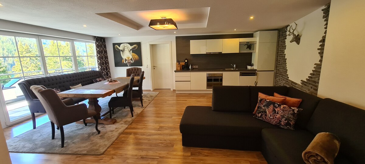 This luxurious flat in the Schooren des Alpes combines alpine charm with modern design and maximum comfort. Designed by a renowned Austrian interior designer, it offers you a temporary home that leaves nothing to be desired. The flat impresses with a private sauna, free-standing bathtub for relaxing hours and a cosy fireplace. cosy fireplace. The impressive 71 m² terrace offers you a wonderful panoramic view of the surrounding mountain landscape.