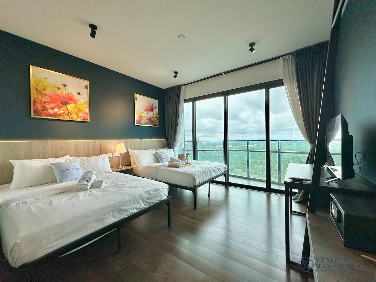 - 520 sqf build up area - 1 king bed and 1 queen bed - Aesthetically designed for 4 pax - Allocate with wardrobe in the room - Rain shower with water heater - 2 unit of air-conditioning - Flat screen smart tv - Sea view balcony Kitchen - Dining table with 4 seated dining chairs - Refrigerator and microwave - Electric kettle - Cooking hood and hob - Washing machine Free car park - You can park at the visitor parking at basement Please take note that we only provide one access card and one key.