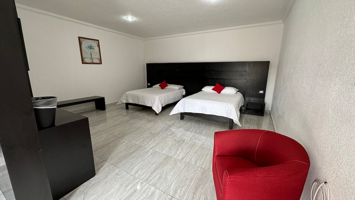 Habitación de hotel con entrada independiente cuenta con: -1 Baño completo -Agua caliente -2 toallas, jabon y shampoo -Cama king size sognare y 4 almohadas -Aire acondicionado -TV con roku -WIFI -1 Closet -1 rollo y 2 botellas de agua -Estacionamiento 1 lugar por habitación -llave de habitación y tag de acceso al portón Se entrega limpia y desinfectada. "Importante" Servicios como limpieza (para varios días), alimentos, toallas y cobijas extras no están incluidos.