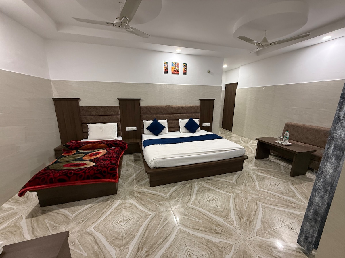 Whether you're embarking on a spiritual journey, exploring the natural beauty of Katra, or simply seeking a comfortable stay with your loved ones, our Quadruple Room at Hotel The Vaishvik offers the perfect retreat. With spacious accommodations, full access to hotel amenities, and a prime location near key attractions, your stay with us promises to be memorable. Experience the perfect blend of comfort, convenience, and culture at Hotel The Vaishvik.