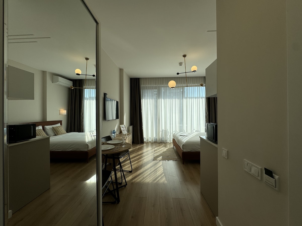 Приветствую всех, кого заинтересовали мои апартаменты. Двухкомнатные апартаменты с отдельной спальней в апарт отеле на берегу Черного моря. Отель расположен на первой линии ,с прямым видом на море из двух имеющихся балконов.Всего в 5 минутах на автомобиле от международного аэропорта Батуми. Месторасположение на Новом бульваре даёт возможность насладиться тишиной,доносящимся шумом волн,подчеркивая преимущество удаленности от многолюдных потоков. В отеле есть охрана, консьерж служба,ресторан