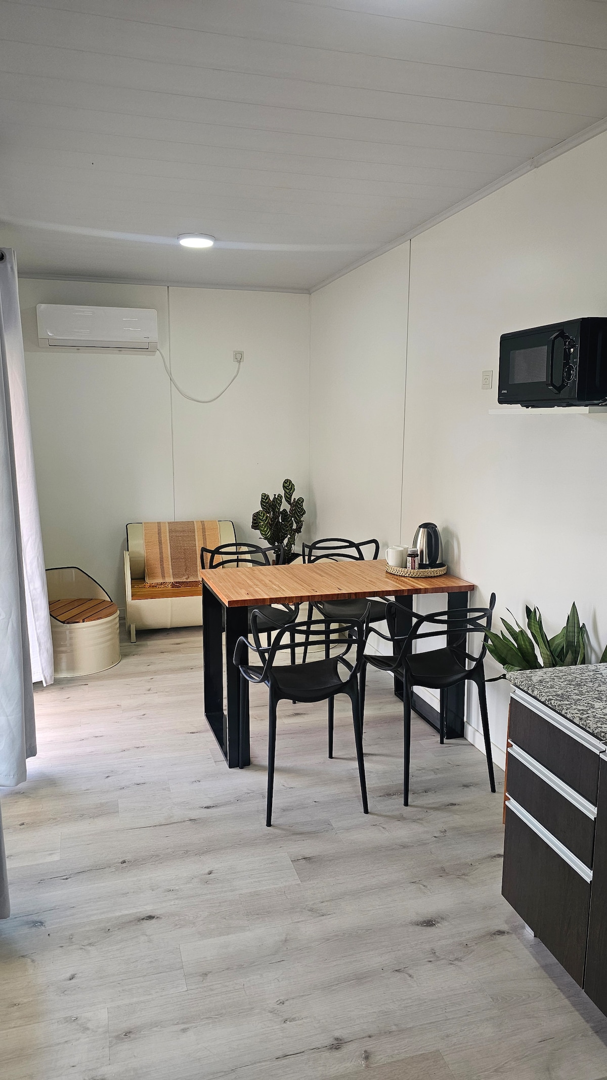 Te ofrecemos una distribución funcional, luminosa y confortable. Cuenta con un dormitorio independiente con cama matrimonial o dos camas individuales, ropa de cama de calidad y vistas al entorno natural. El espacio integra cocina, comedor y estar en un ambiente moderno, con salida directa a la terraza. La cocina está totalmente equipada y el baño es cómodo y moderno, con ducha, toallas y amenities incluidos. Un espacio pensado para descansar, con privacidad y conexión con la naturaleza en La Paz