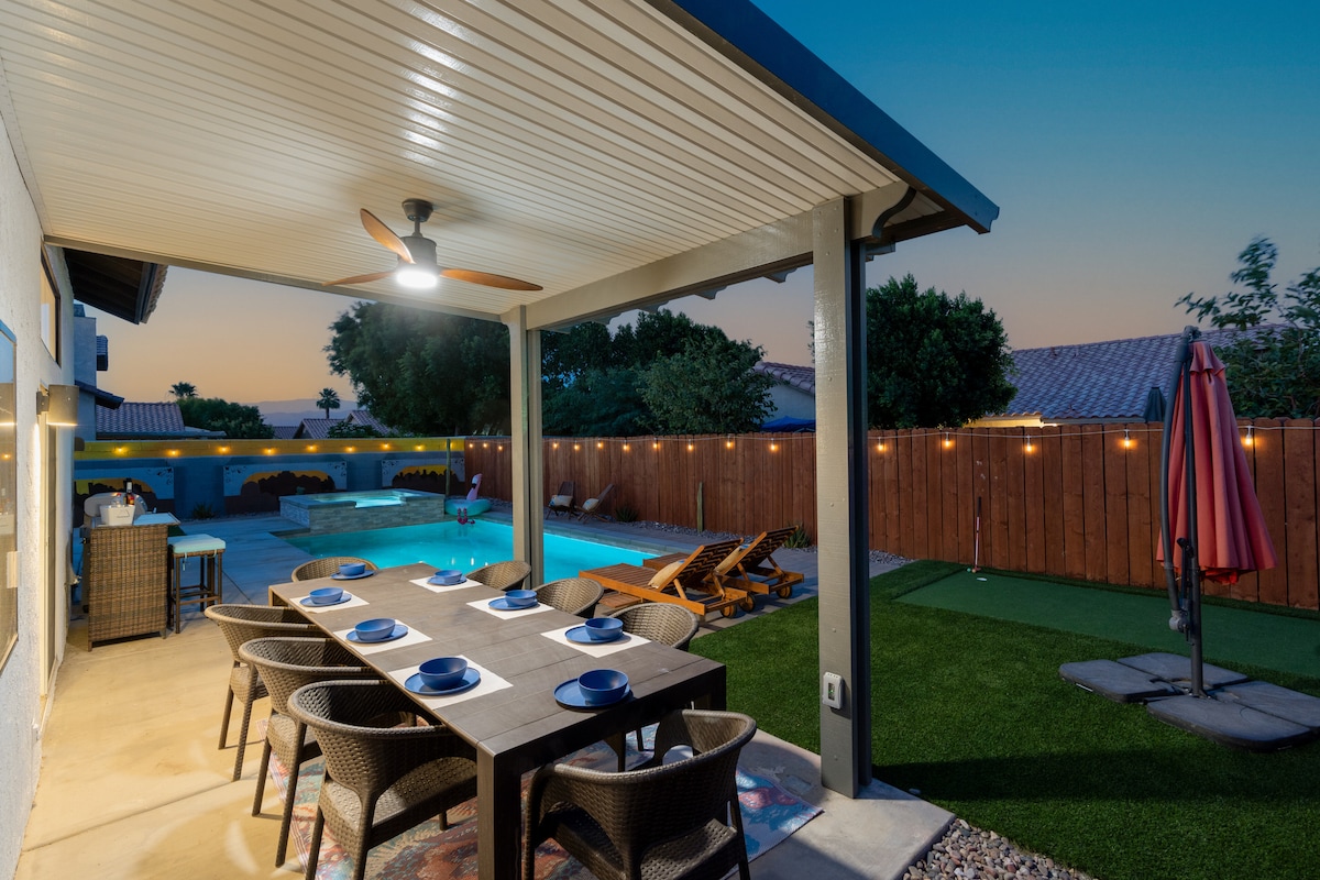 Huge (20'x40') heated/cooled salt-pool/spa with tanning deck/basketball hoop. Putting green/fire pit in huge backyard (0.32 acre) surrounded by unobstructed mountain views. Big patio w/dinning table for 10, 6 burner bbq grill/pingpong/cornhole. Airhockey/Foosball/65" TV w/ YoutubeTV/Netflix/Disney+. A fully-stocked gourmet kitchen, purified water, Nespresso machine. Hotel-style amenities. Close to all stores, restaurants, Tennis and Coachella. No party allowed. LIC-067667