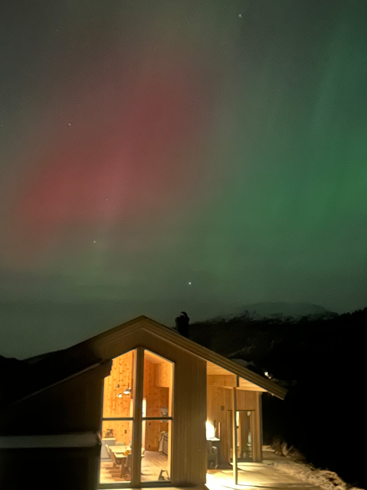 Live "Heilt Pao Kanten" with stunning views of the Lustrafjord. Beautiful cabin for rent. Kitchen, living room, 1 bedroom. Outdoor toilet and outdoor shower. Gas refrigerator and gas burner, solar cell for charging. You can rent a hot tub, electric bicycles, SUP boards or a snazzy Fiat 500 to drive around (for a fee, NOK 1500 for the hot tub). Great hiking opportunities in the community. Mountains and water! Park up on the farm and walk down about 250 meters to the cabin. The hot tub and shower are located next to the main house. See more info at raaum.no