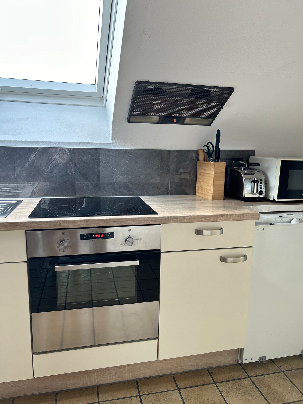 (URL HIDDEN) approx. 110 m² attic apartment large living/dining area with kitchen Oven, Dishwasher, Refrigerator, Coffee Machine In the kitchen you will find everything you need for cooking dishes and glasses is available enough Bathroom with toilet and hairdryer 2 bedrooms with double beds 1 children's room with crib and bed 90 x cm 200 Sat/TV , Radio-CD Car parking space in front of the house Large garden with barbecue facilities fast internet access via WiFi non-smoking apartment