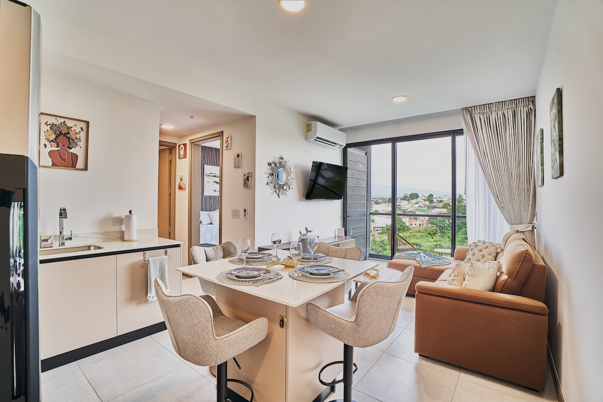Discover this cozy 1 bedroom 1 bathroom apartment in San José. Equipped with 2 65" 4K Smart TVs, A/C in the bedroom, a fully stocked kitchen, and a large balcony perfect for relaxing with city views. Enjoy the luxury facilities, including a 17-meter-long pool and a gym. The condominium offers 24/7 security and parking for 1 vehicle. Conveniently located near important areas of San José and the airport.