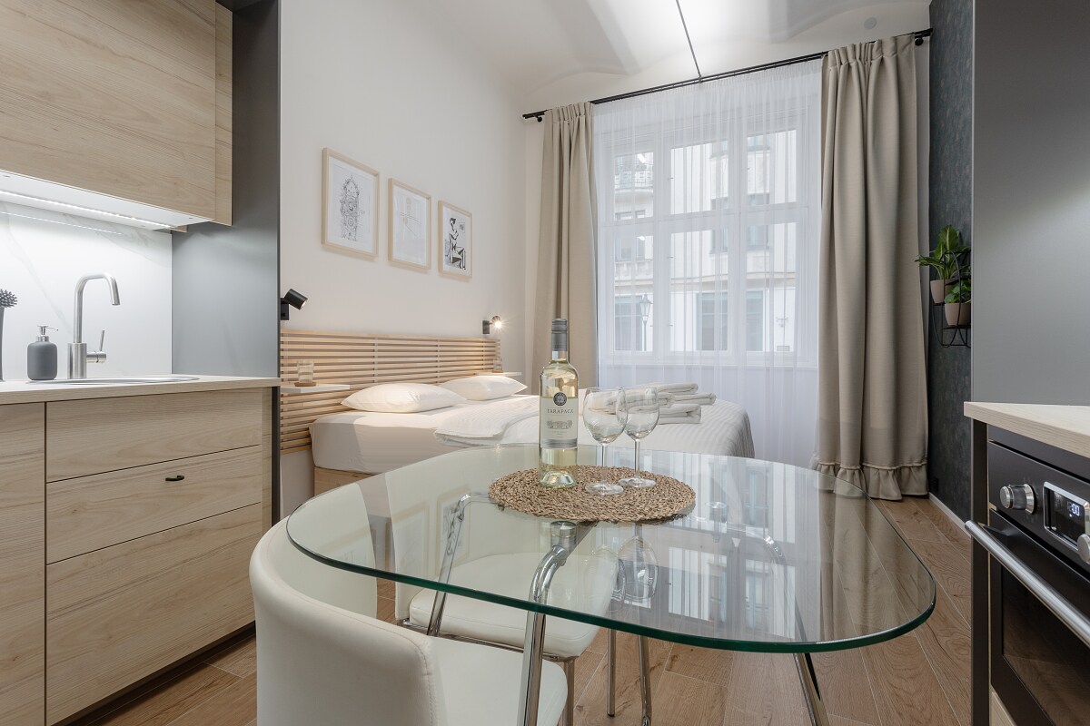 Wake up on a sumptuous bed with romantic netting and string lighting. The apartment has been designed by Brunetti, a renowned Prague designer, with exquisite furnishings and a statement mirror. A private balcony faces the inner courtyard. There is a brand new orthopaedic mattresses with memory foam from 2024 for the best sleep ever :) This great neighborhood allows you to also enjoy local life while being close to the historical center.
