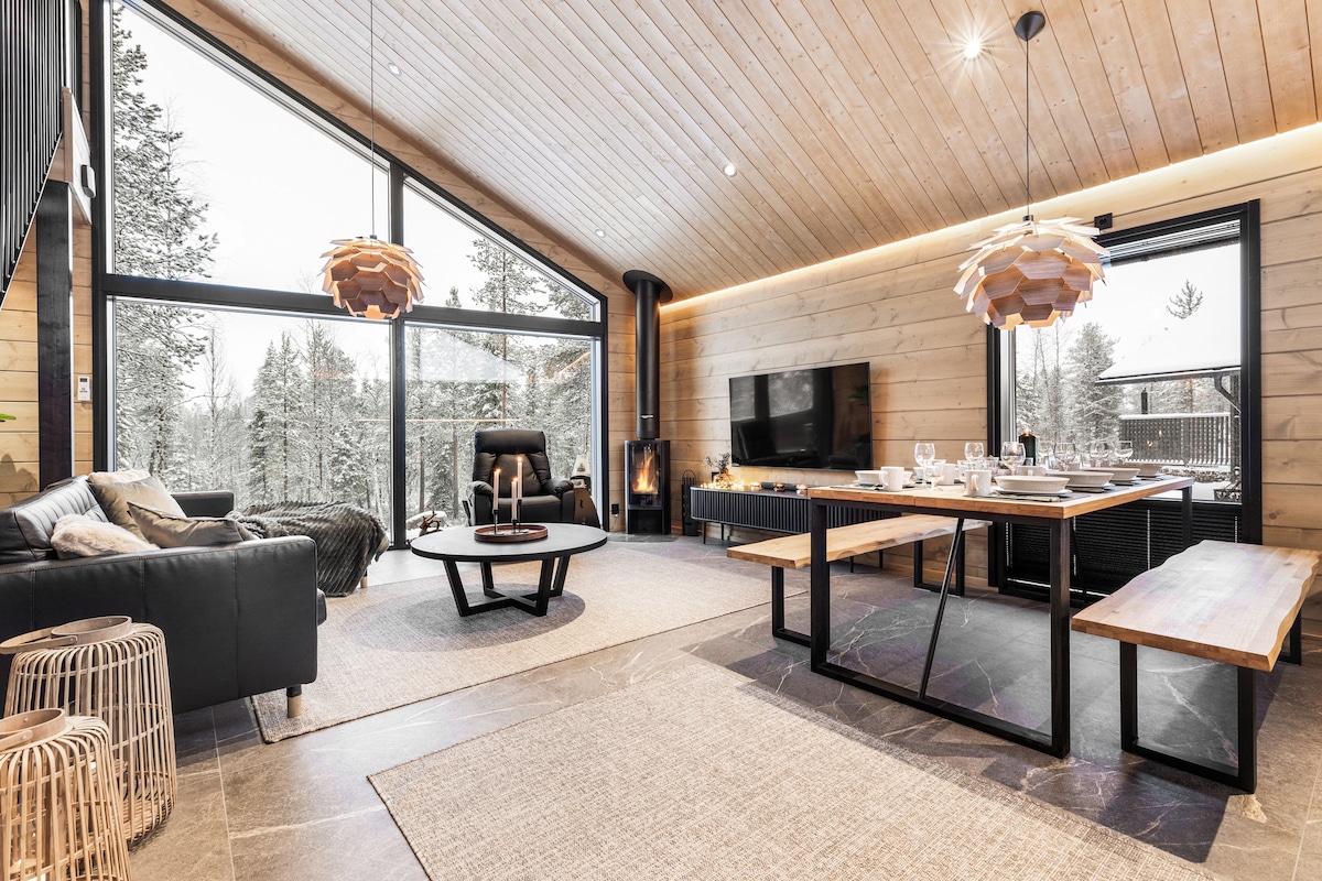 Our cozy and well-equipped Villa at Levi offers the perfect blend of comfort and nature. The open-plan kitchen and living area is ideal for spending time together, with plenty of space to relax after outdoor adventures. The logation is beside Levi’s services yet surrounded by tranquil forests, you'll enjoy convenience and natural beauty. If you are lucky at the evenings you can see nothern lights from big terrace. The villa with two homes, both having 100% privacy. 5G Wi-Fi and 3 televisions.