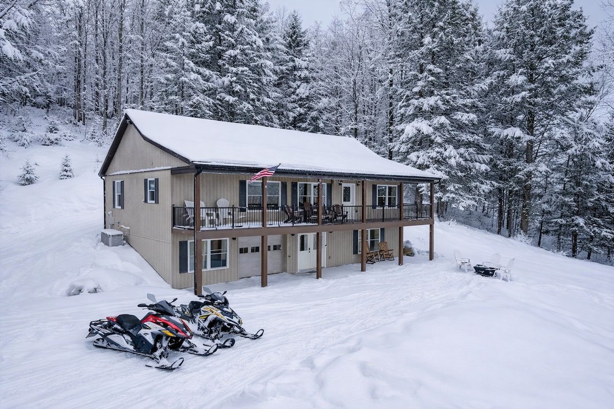 This beautiful open floor plan is centered around the propane fireplace. Come sit on the wrap around porch and listen to the turkeys gobble. The three acre parcel sits on the snowmobile and atv trails of Lewis County. Enjoy walking to center square Brantingham and having dinner or a drink . This setting is ideal for a getaway. Walking trails , golf course and biking. Old forge is less than a hour away. Come stay with us, you won’t regret it!