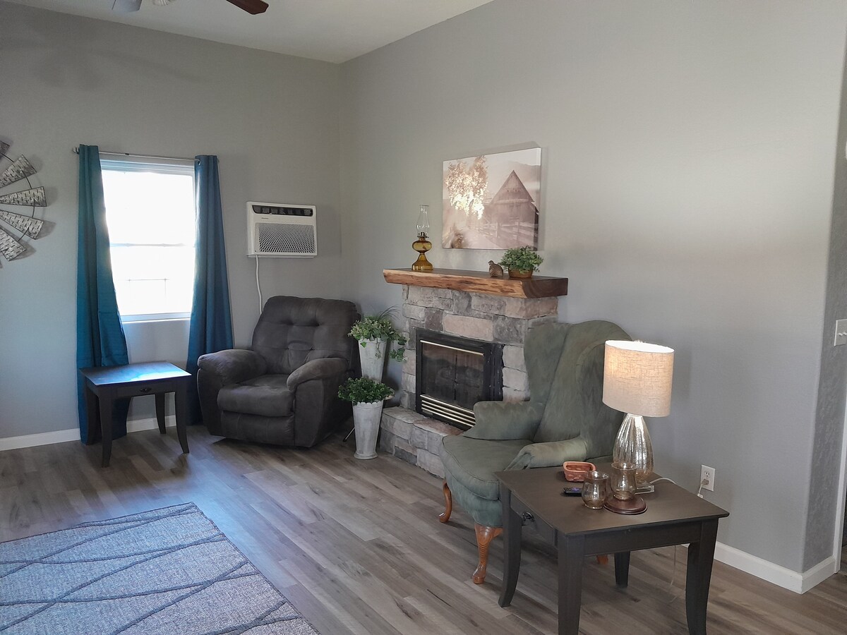 This spacious cabin has 1 bedroom with a comfortable, king sized bed, a queen sized hide a bed couch in living room, and a well equipped kitchen. The outside sitting area is a peaceful oasis with the view of the cattle and horse farm. An outside outlet is available for charging your boat. Bike, walking trails, and a marina are all within 1. 4 miles. Downtown shopping area is 5 minutes away. Roku and wifi are available.