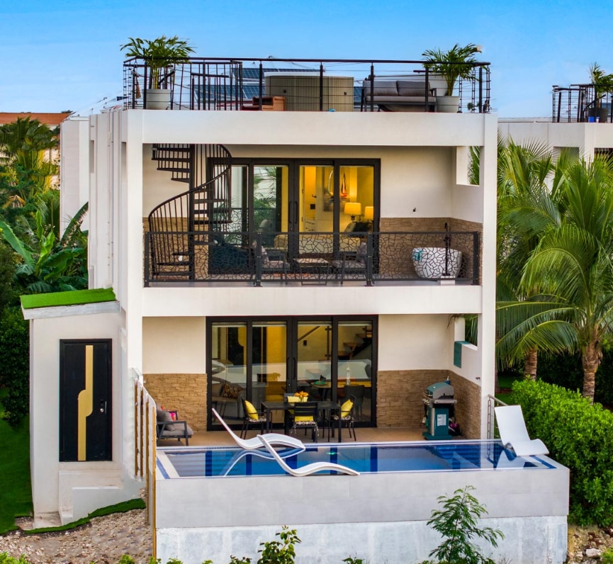 Gardenia Villa. This contemporary Oasis is perfect for a small family or couples, located steps away from the world’s #1 Grace Bay Beach. The villa entrance opens to a bright entryway leading to the living room area with a spectacular view through a wall of sliding doors to the covered deck and pool. The open plan is perfect for entertaining with the dining and kitchen area all part of the living space. The upstairs consist a master King and second queen sized bedrooms both ensuite baths.