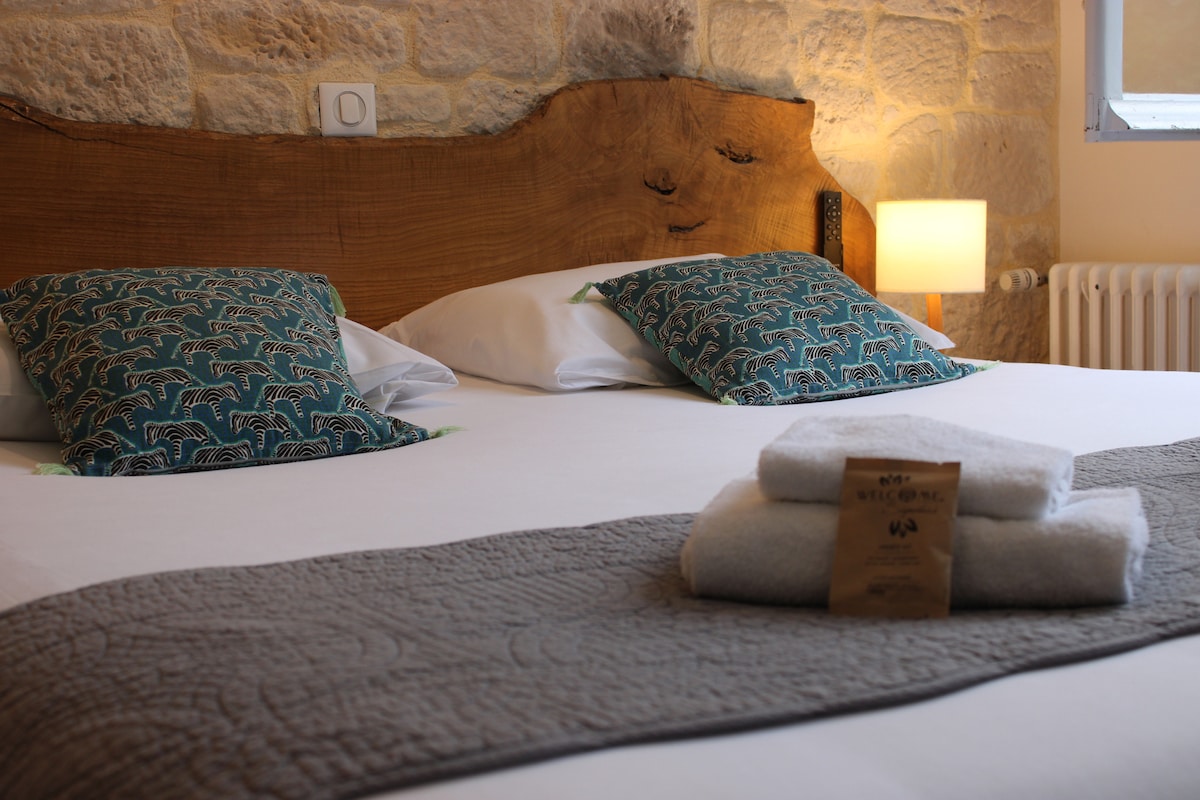 Bedroom for rent equipped with bathroom, toilet and tv in a small Perigord house with a beautiful enclosed garden ideally located in the Vézere valley. Grand Préau with barbecue at your disposal
