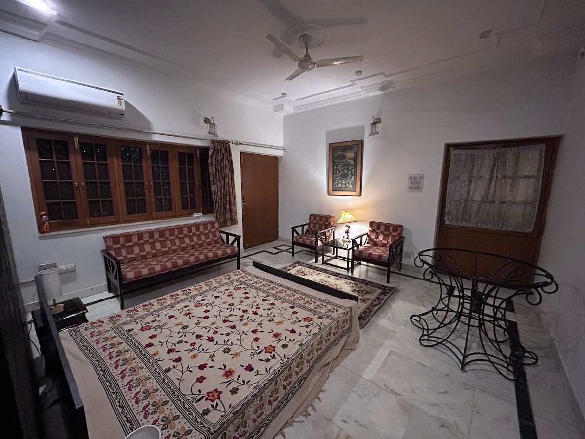 Elegant Villa Room with Garden View Unwind in our serene, sunlit villa room nestled in the heart of the city . This spacious private room features a plush king sized bed, ensuite bathroom, and charming rustic decor. Doors open to a private patio overlooking lush gardens—perfect for morning coffee . Ideal for couples, solo travelers, or digital nomads seeking comfort, privacy, and a peaceful escape—yet just minutes from local attractions and cafes. Homemade customised food arrangements mughlai