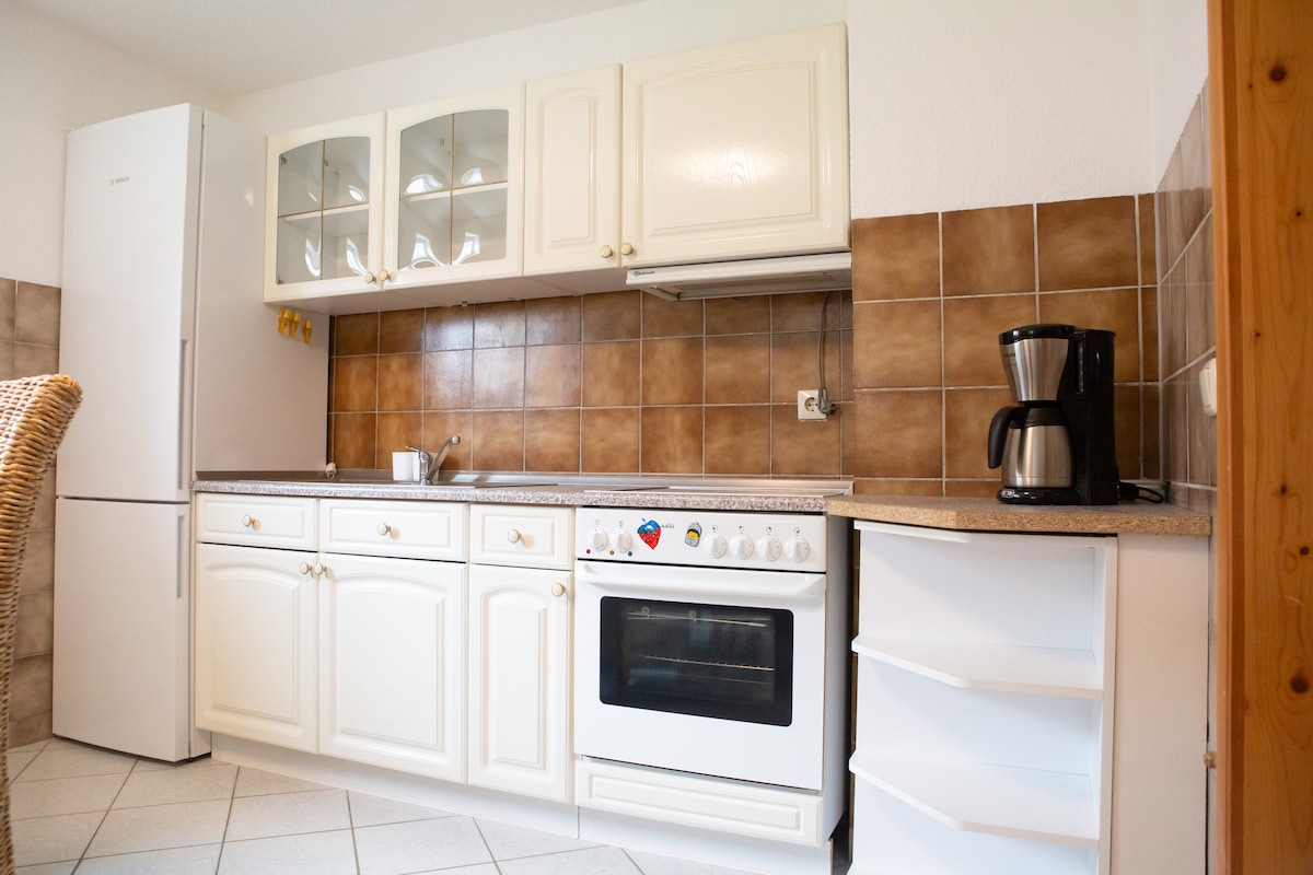 Kick back and relax in this calm, beautiful environment. From the upper bedroom overlooking Lake Neuwarper, you can watch the deer in the reed bed at dusk. Enjoy the open living, dining room with kitchen and kitchen counter. The fireplace warms in the cold season. Or work on the beautiful old Biedermeier secretary. The terrace with natural stones invites you to linger. On the balcony you can enjoy breakfast at sunrise.