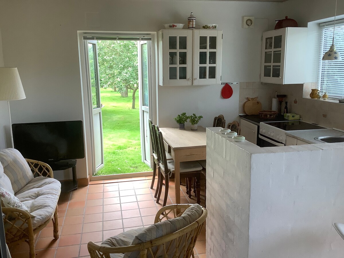 Stay in your own house on the island of Thurø in the middle of the beautiful, southern Funen countryside with the forest as a neighbor and close to the water. You can enjoy good beaches and hike in the island's forests and out on the beach meadows. Enjoy the cozy atmosphere of the old woodcutting workshop. The house has its own entrance. It includes a bedroom, bathroom, kitchen and living room. In total, the house is 40 square meters with its own terrace and access to the garden. Not suitable for wheelchair users.