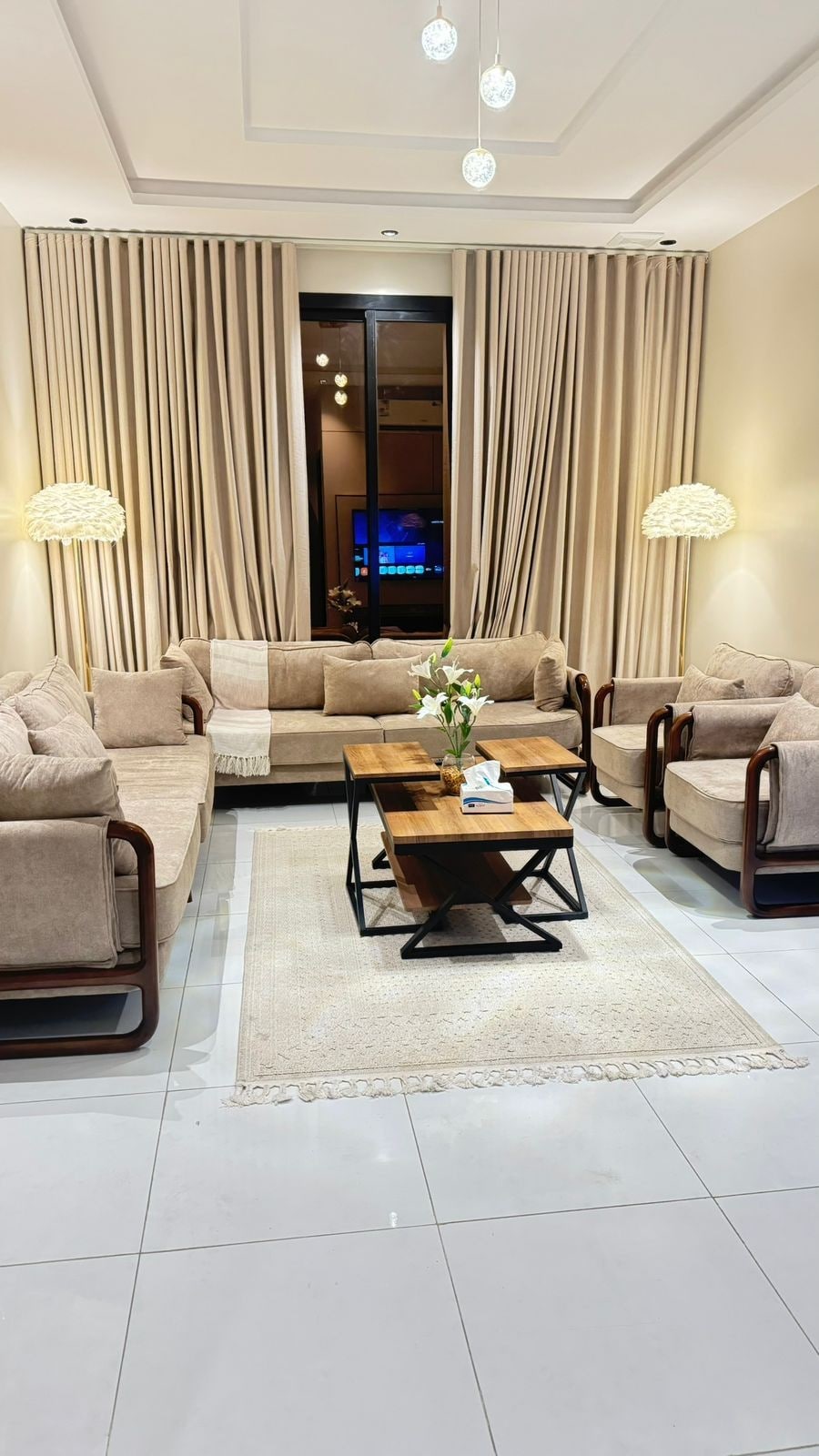 The suite has a comfortable bed with a high-quality medical mattress, hotel mattresses and pillows, a nice sitting area, a table and a bathroom In addition to a coffee corner with a coffee machine, hot drinks and complimentary water for our valued guests Also, a refrigerator, microwave, Arabic coffee machine, smart TV, internet service, ironing board, bathroom tools, and washing machine. The lighting is calm and comfortable, and the room has privacy and quiet The location is lively, in front of it is a walkway, a ball court, and a garden with games for children, and close to it is a mosque and a public transport bus, and all services, including restaurants, are around it 3 km from the campus
