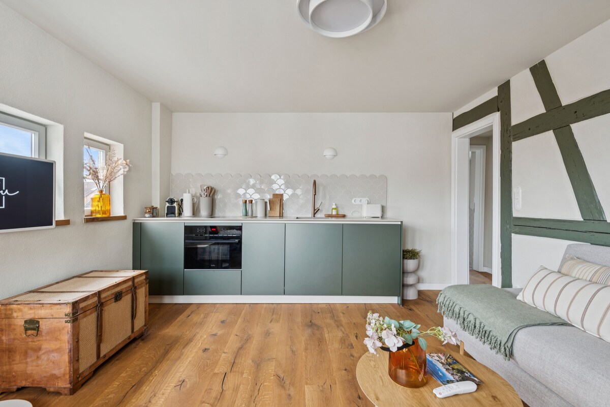 Treat yourself to a visit to our half-timbered house Anno 1690, renovated in 2019, in the very quiet old town of Stromberg, right by the Schlossbrunnen fountain below the 3 castles. The kitchen on the 2nd floor is excitingly located in the former battlement of the city wall. The medieval building still has the typical steep oak stairs and the ceiling height is outside the norm. Cozy stay in the house and as a starting point for hikers & bikers....for relaxation and adventure...