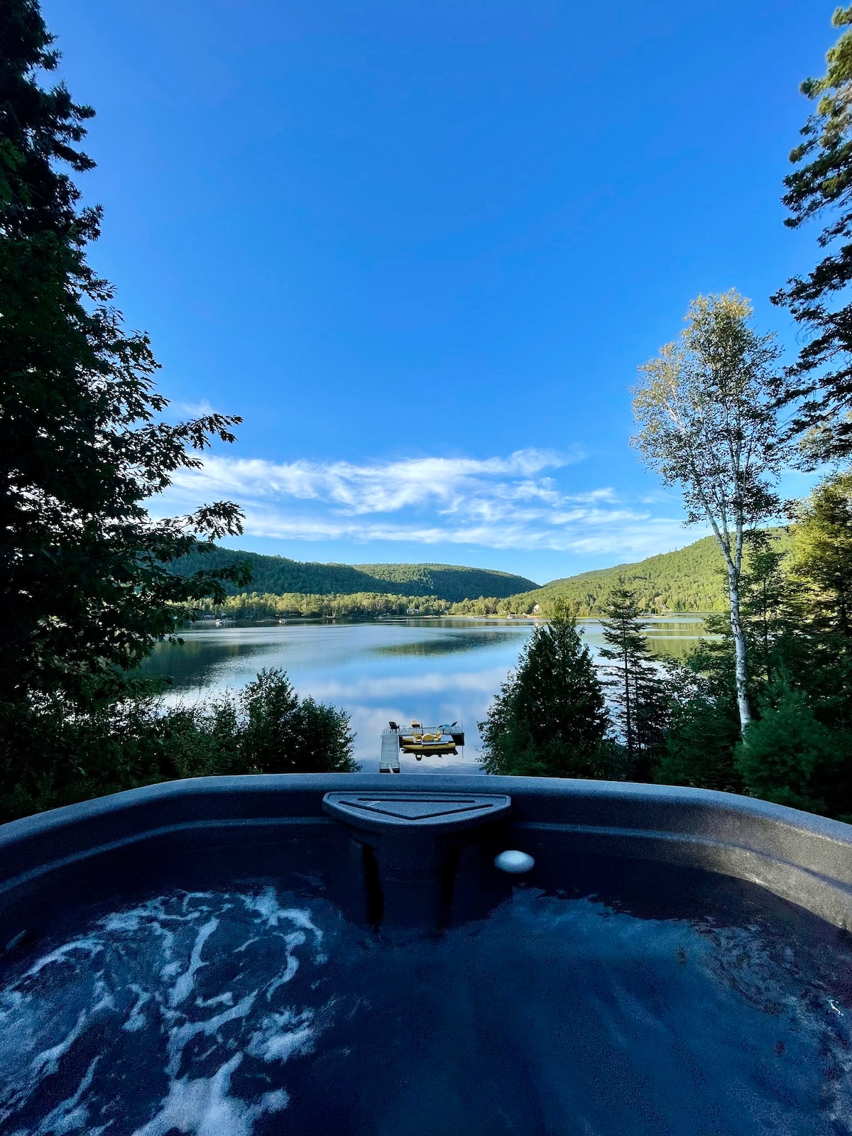 Warm and welcoming chalet located 1h45 from Montreal, in Mandeville, Lanaudière, on Lake Ste-Rose, ideal for up to 8 guests. Enjoy direct lake access with private beach, dock, kayaks, stand-up paddle board and rowboat. Relax in the year-round outdoor hot tub, enjoy the pool table, foosball and fireplace. High-speed internet, large terrace and peaceful natural setting. Hiking trails and ZEC des Nymphes accessible directly from the property. Pets accepted with conditions. No parties.