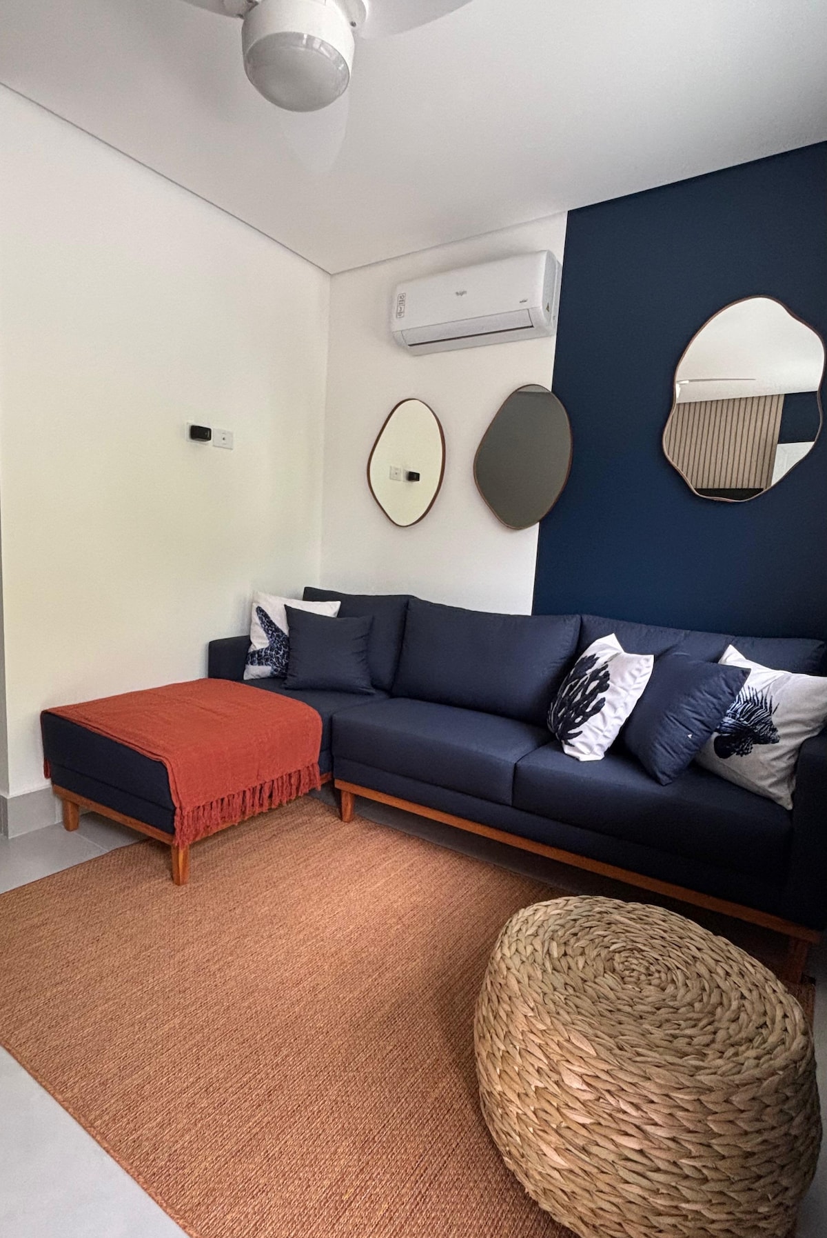 The apartment is cozy, very nicely decorated, with two bedrooms, one of which is a suite. Ideal for 4 people, but accommodates 5 well. Both the living room and the bedrooms have split air-conditioning. The kitchen is well equipped, including a 2-burner cooktop, electric oven, coffee maker, toaster and kitchen utensils.